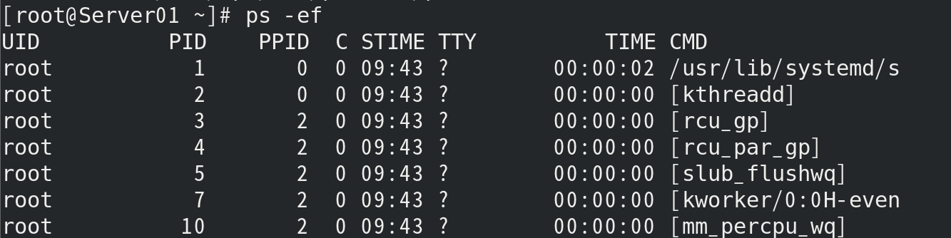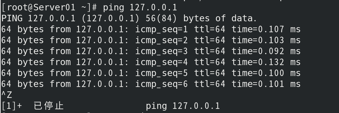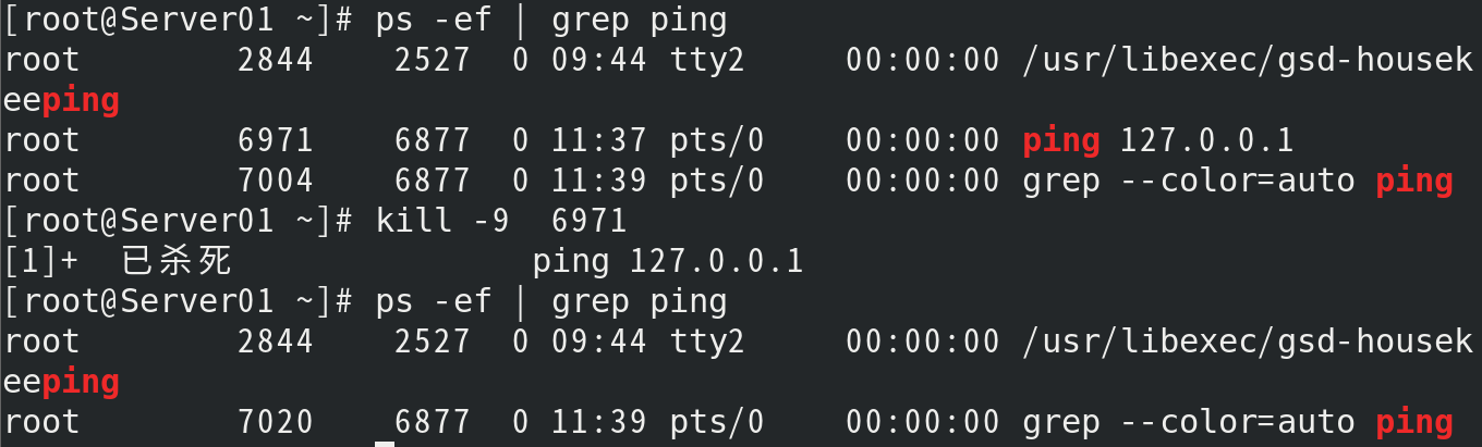 (5) 使用ps -ef查看当前系统所有进程;输入ping 127.0.0.1命令,然后按 ctrl+Z快捷键,使得进程在后台运行;使用ps -ef命令查看ping对应的进程号;用kill命令终止该进程,看效果;如果无法终止,用-9强行终止;再用ps -ef看终止结果。 [root@Server01 ~]# ps -ef [root@Server01 ~]# ping 127.0.0.1 [root@Server01 ~]# ps -ef | grep ping [root@Server01 ~]# kill -9 6971