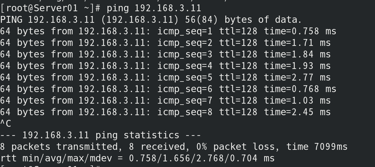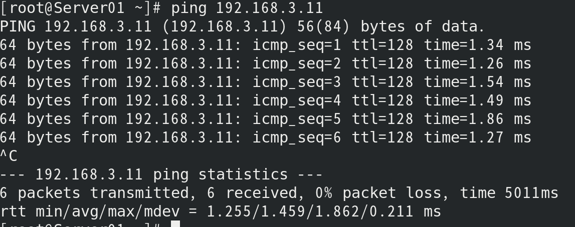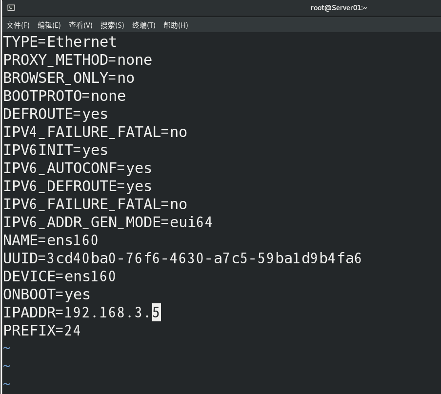 (8)使用网卡ens160配置文件进行网络配置,配置主机IP 为192.168.X.5,检测主机与宿主机的连通情况。 [root@Server01 ~]# vim /etc/sysconfig/network-scripts/ifcfg-ens160