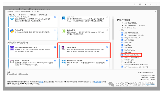 选择.NET 桌面开发工作负荷以及可选的 ML.NET Model Builder 组件。