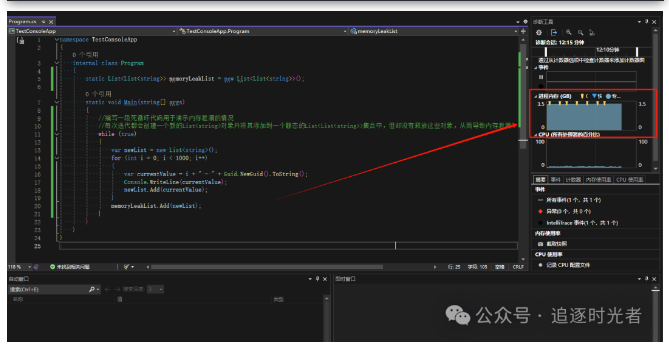 //每次迭代都会创建一个新的List<string>对象并将其添加到一个静态的List<List<string>>集合中,但却没有释放这些对象,从而导致内存泄漏