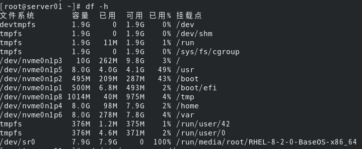 二、开启虚拟机, 使用root用户登录。用df -h 命令可以看到光驱已经正常连接了。如果看不到/dev/sr0,需要重新做第一步。
