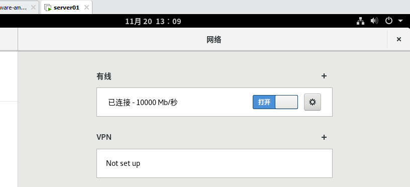 一、配置前,先让虚拟机可以上外网,打开“设置”--》“网络”--》打开有线连接