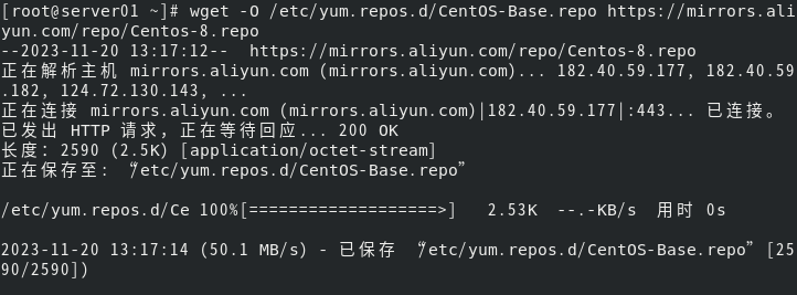 [root@server01 ~]# wget -O /etc/yum.repos.d/CentOS-Base.repo https://mirrors.aliyun.com/repo/Centos-8.repo