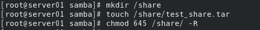 在Server01上建立share目录,并在其下建立测试文件,设置共享文件夹本地系统权限。 [root@server01 samba]# mkdir /share [root@server01 samba]# touch /share/test_share.tar [root@server01 samba]# chmod 645 /share/ -R