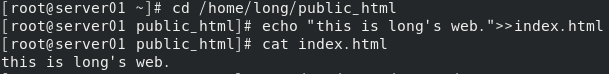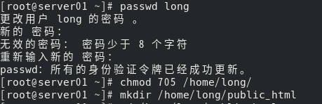 任务二 发布用户个人主页。 操作步骤: 1、创建用户long,修改用户long的家目录权限,使其他用户具有读取和执行的权限。