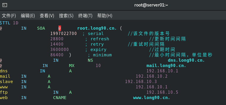 任务五 配置域名访问Web服务器。 操作步骤: 1、 修改DNS正向查询文件