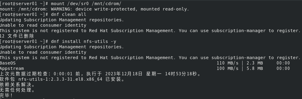 8、client1用命令” dnf install nfs-utils -y“,安装nfs-utils软件包。