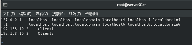 7、用“cat /etc/hosts”命令查看文档中内容,发现只有server01的主机名,现在需要把server02和client1这两台主机名设置进去。
