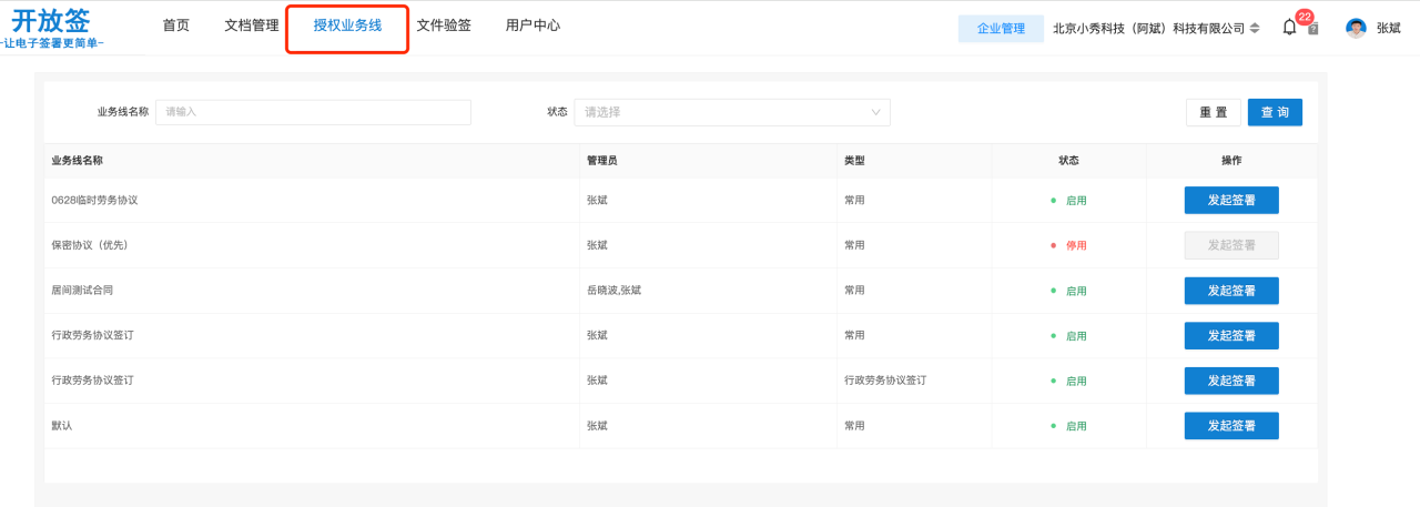 1、发起签署,选择发起业务线的交互优化:增加“授权业务线”界面,统一在“授权业务线”界面发起合同;