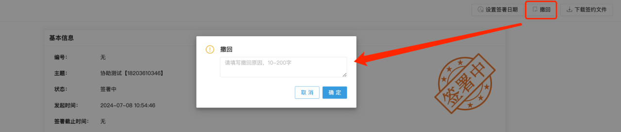 6、处于“签署中”状态的合同支持撤回功能,即处于“填写中”和“签署中”的合同件均可以撤回;