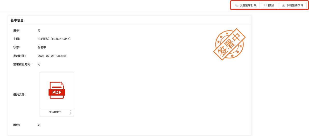 9、文档详情页面增加“撤回”、“设置/修改签署截止日期”、“填写”、“签署”等操作;