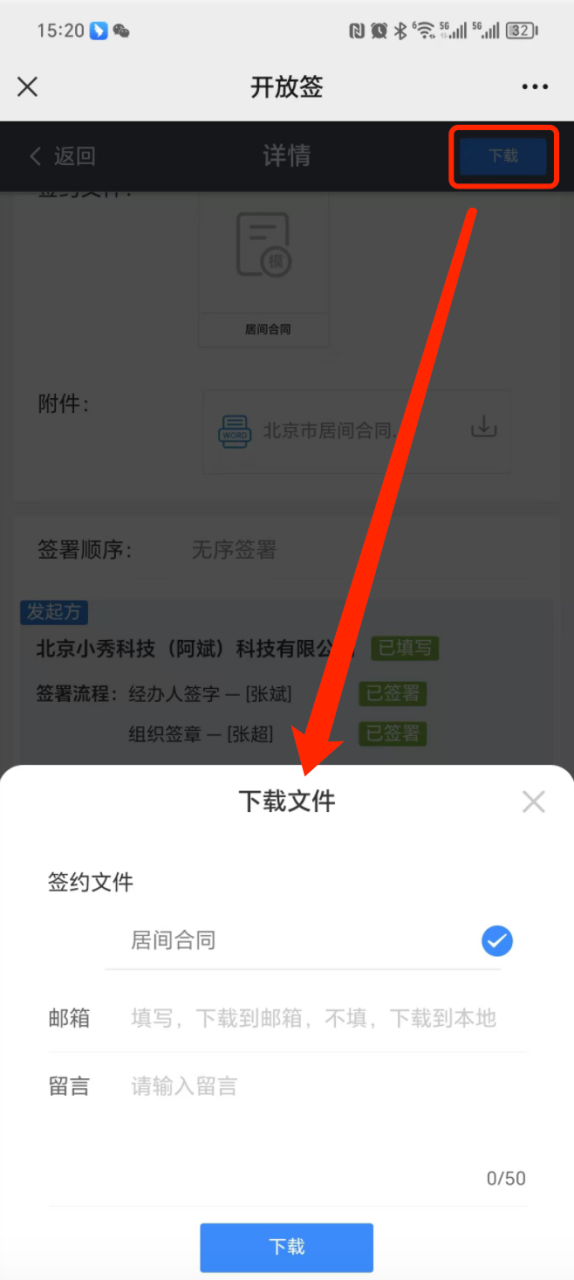 11、手机端H5文档详情页面支持下载签约文件到指定邮箱;