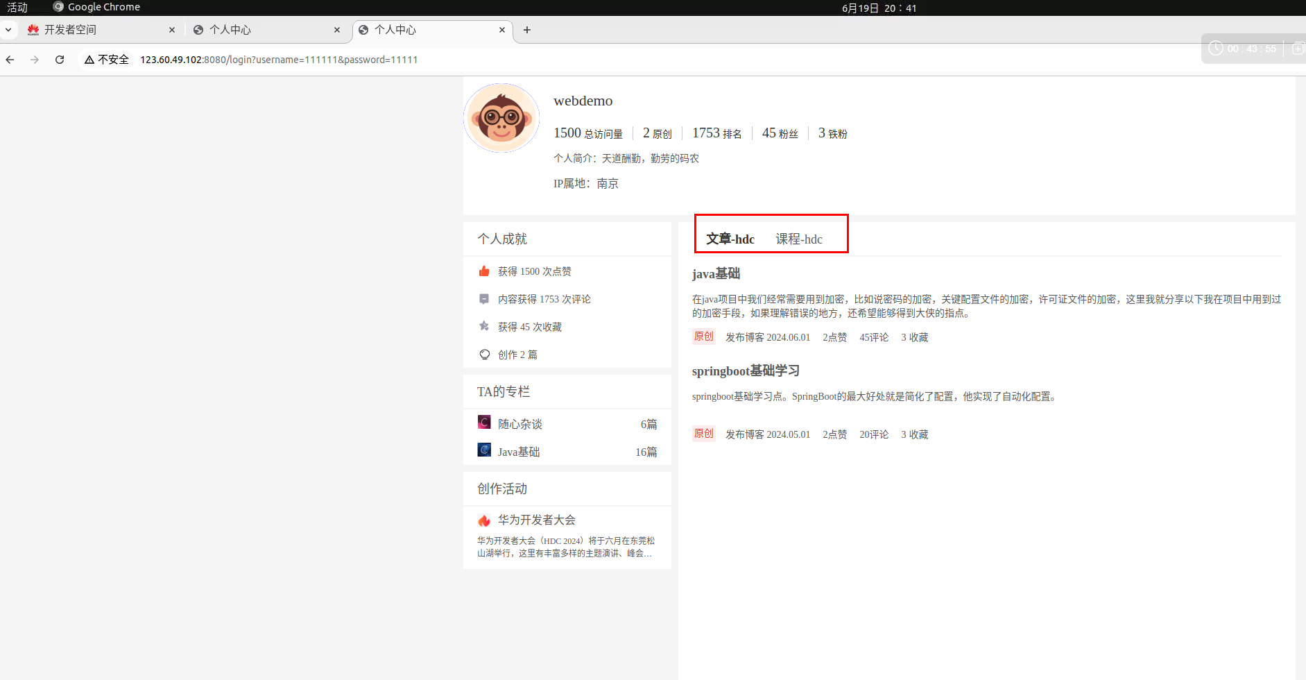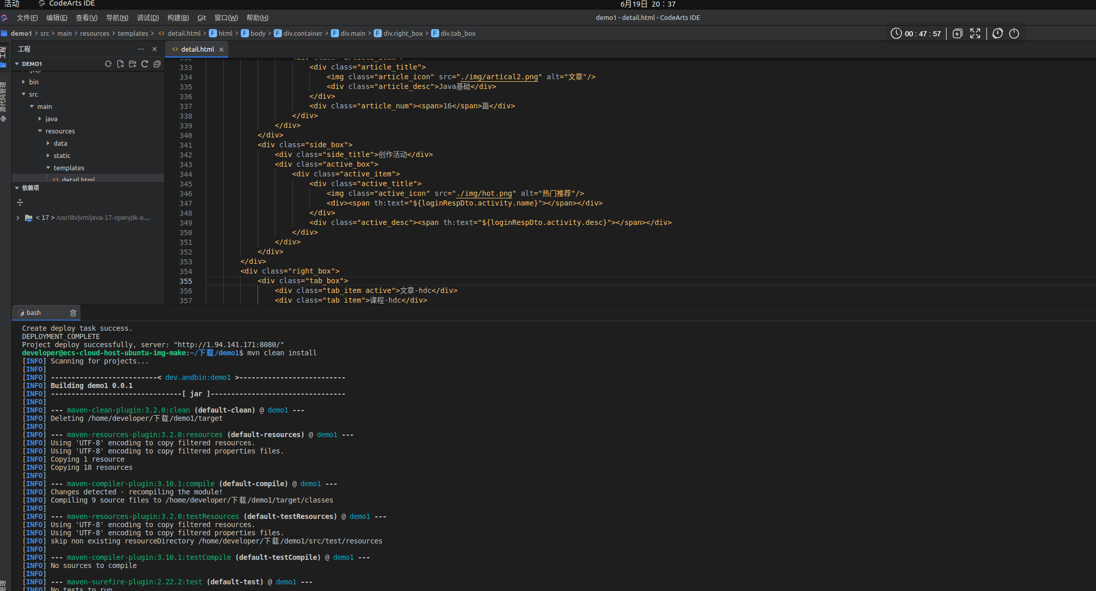 开发者空间个人论坛工程自动化部署,将个人论坛工程导入到云主机,在云主机中CodeArts IDE打开工程,并在终端上部署到远程ECS主机,再修改工程重新打包工程并重新部署到远程ECS主机,用户可以通过公网ip查看部署的工程,全程实践约10分钟