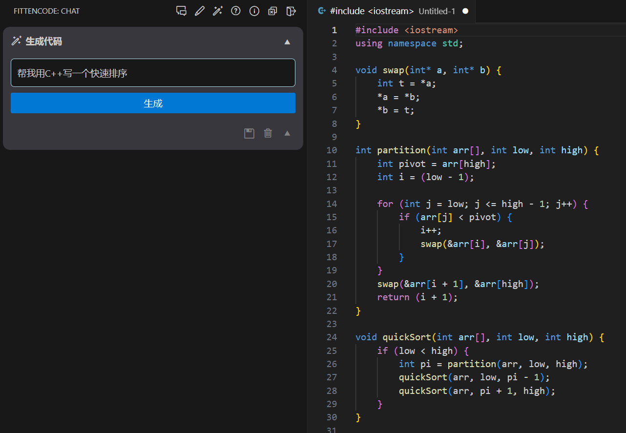 打开代码文件,输入一段代码,Fitten Code 就会为您自动补全代码:
