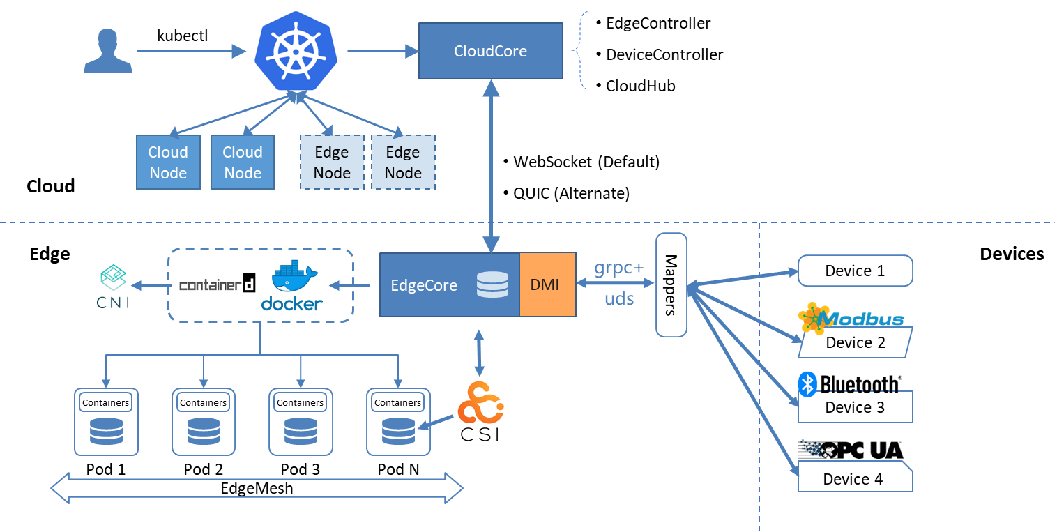 KubeEdge核心的设计理念是凭借Kubernetes中的云原生管理能力,在边缘计算的场景对原有Kubernetes做了功能增强,主要包含以下三点: