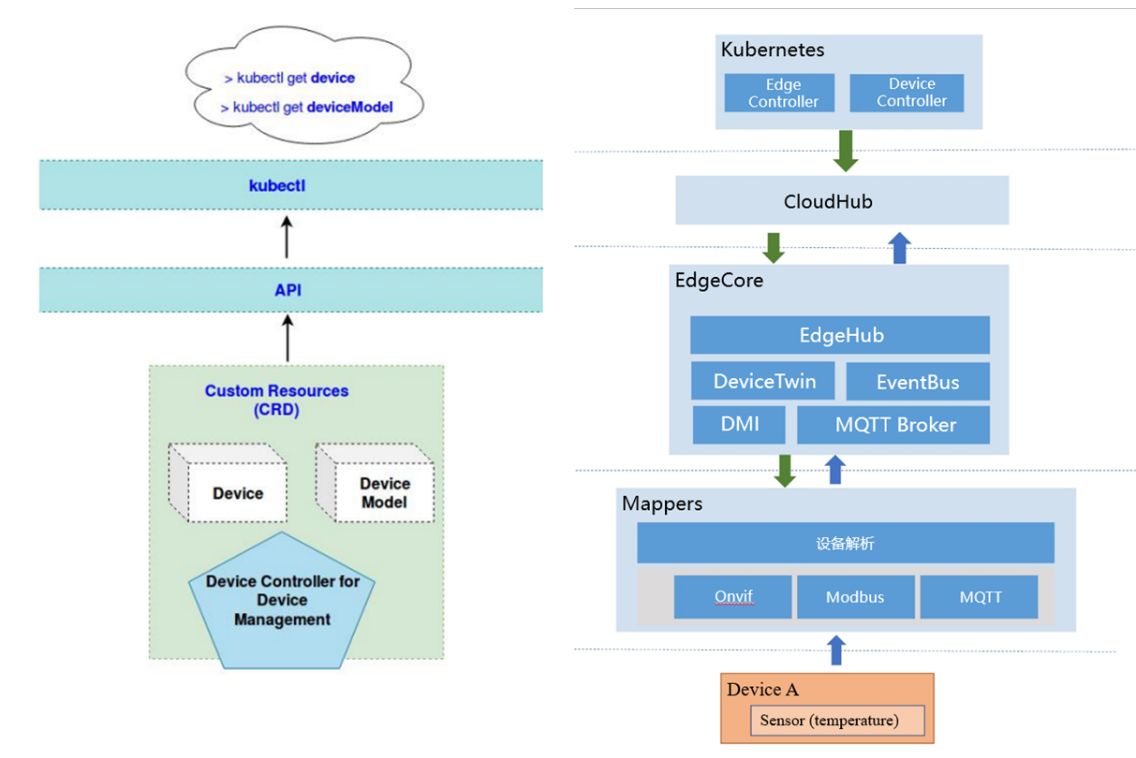 KubeEdge使用云原生的方式管理边缘设备,实现了基于物模型的设备管理API,表现为DeviceModel与DeviceInstance这两个Kubernetes CRD: