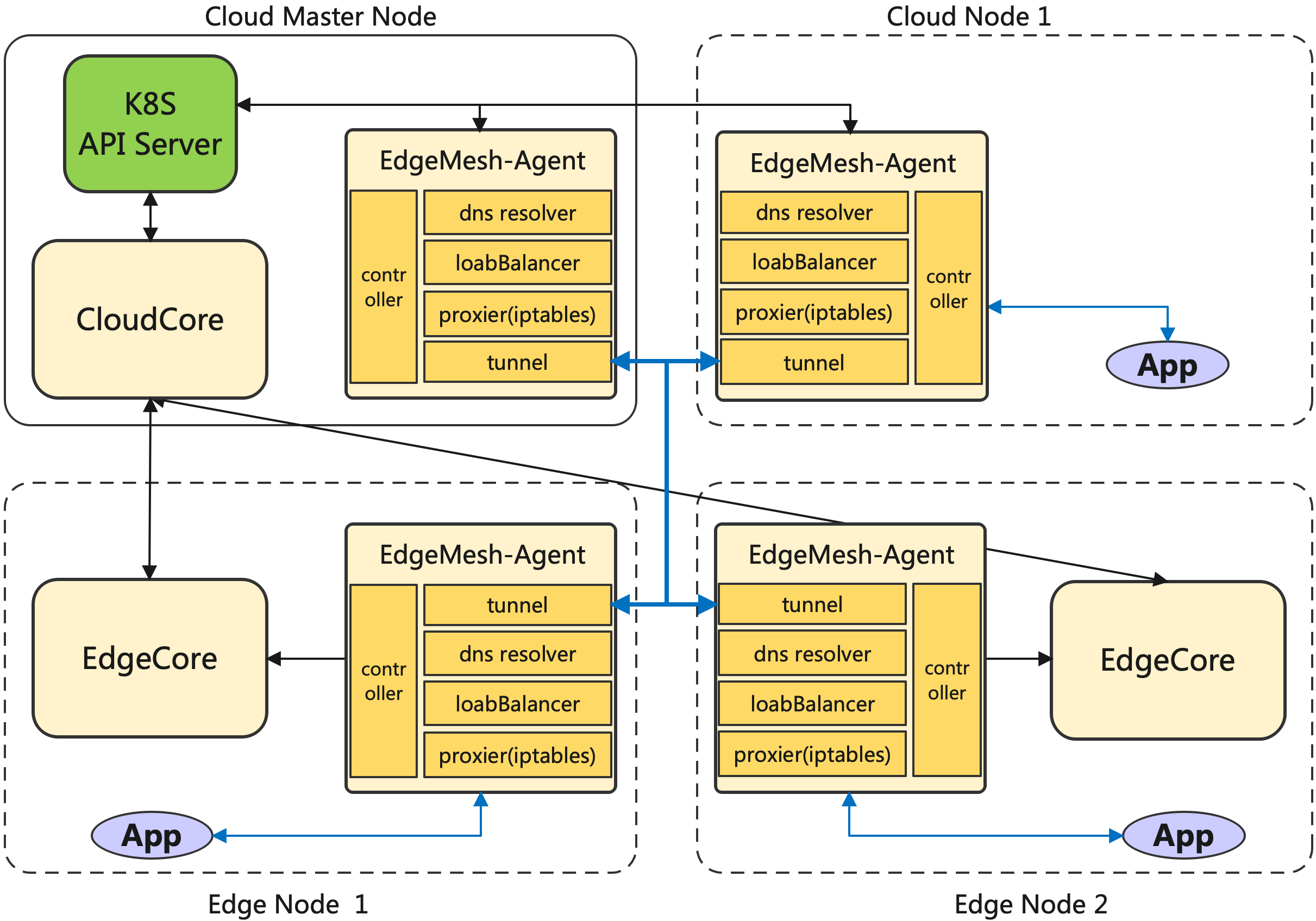 2. 内部DNS服务器。Edgemesh内部实现轻量级的 DNS 服务器,让域名请求在节点内闭环。这一特性主要针对边云连接不稳定的情况,目的是在边缘节点与云节点断开连接后也能正常完成域名解析。