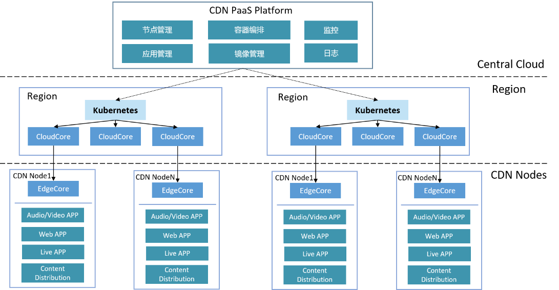 基于KubeEdge的大规模CDN节点管理平台架构如下图所示。需要在各区域中心及数据中心建若干个Kubernetes集群,这些中心具有全量Kubernetes能力,包括负载均衡、网络插件相关能力,能够满足业务部署在中心云的需求,例如区域的日志汇聚、监控汇聚、镜像分发加速的能力,除了传统Kubernetes组件,在区域中心还部署了KubeEdge的云侧管理面组件cloudcore,通过cloudcore纳管边缘的CDN节点,边缘CDN节点全部以edgecore的形式,就近接入区域云端。