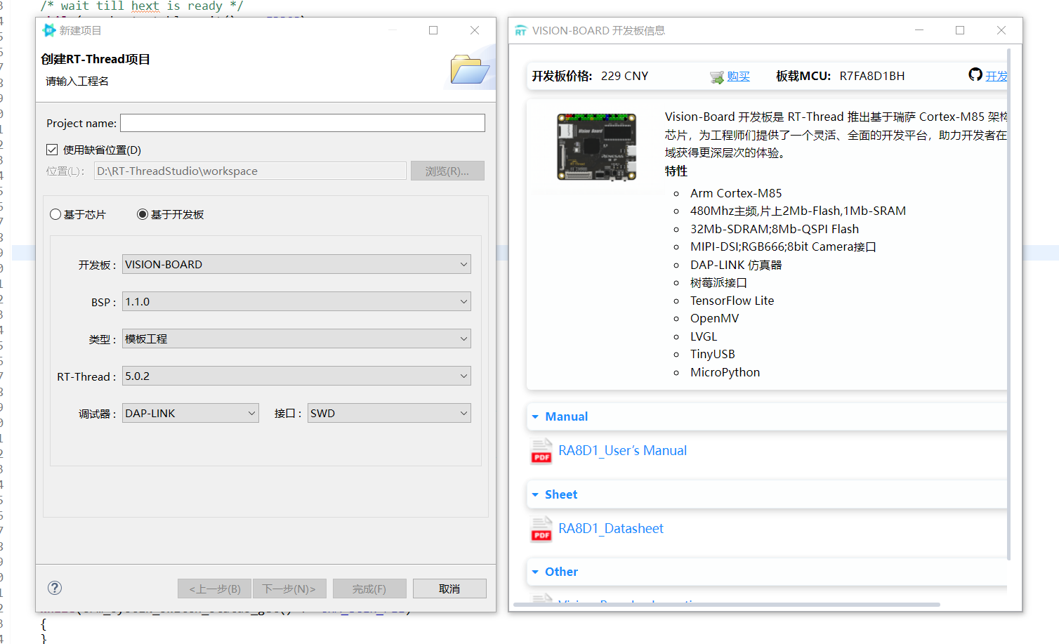 Vision-Board 开发板是 RT-Thread 推出基于瑞萨 Cortex-M85 架构 RA8D1 芯片,拥有Helium和TrustZone技术的加持,性能非常强大。