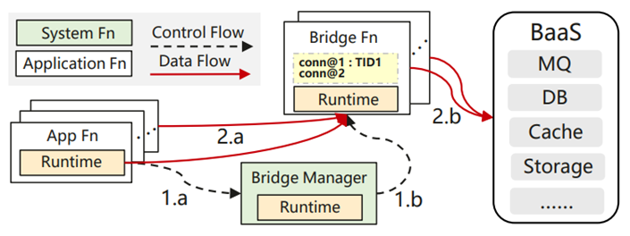- 用户函数和后端服务间交互复杂:后端服务通常是有状态的,并为每个客户端维护经过身份验证的活动连接,例如JDBC连接,但这些连接状态很难在协作的函数实例之间共享。此外,多个函数的并发操作也会导致分布式事务的问题。