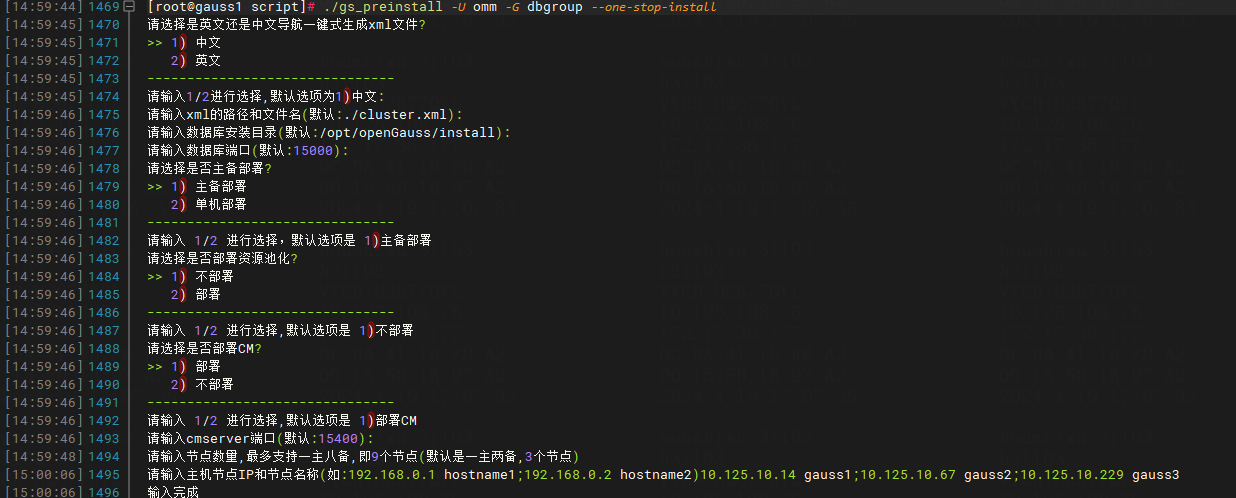 [root@gauss1 ~]# ./gs_preinstall -U omm -G dbgroup --one-stop-install复制复制