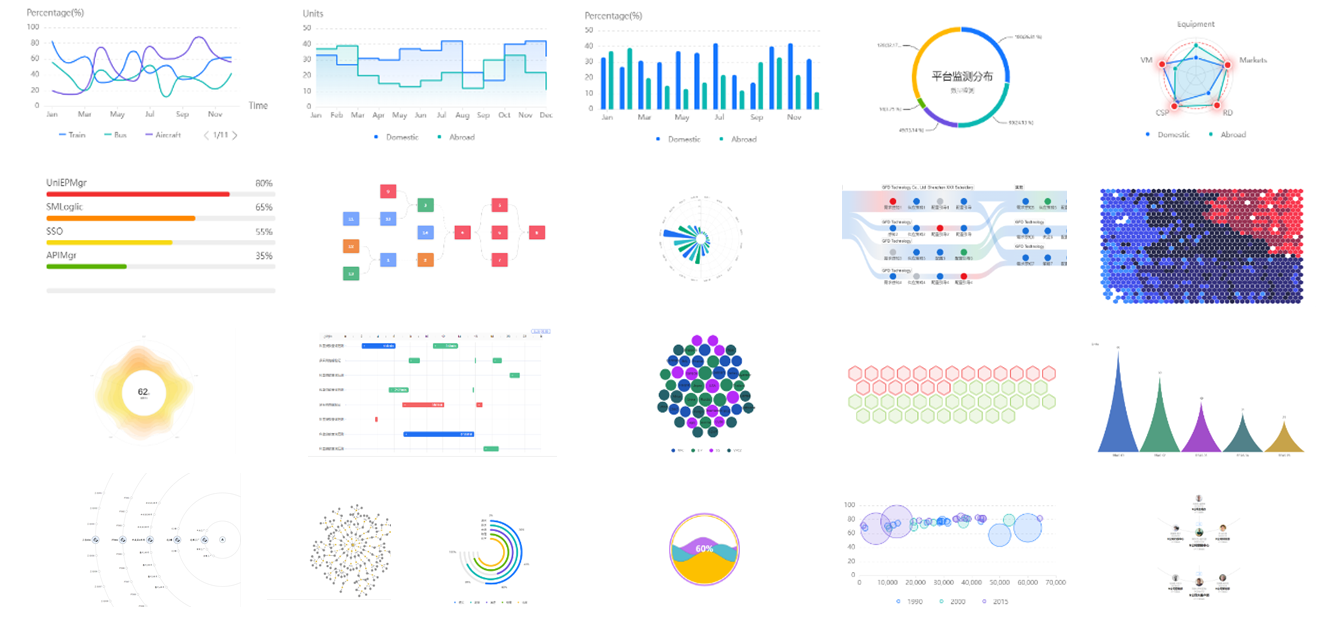 - 基础图表:线形图、面积图、柱状图、圆盘图、雷达图、地图、桑基图等等。