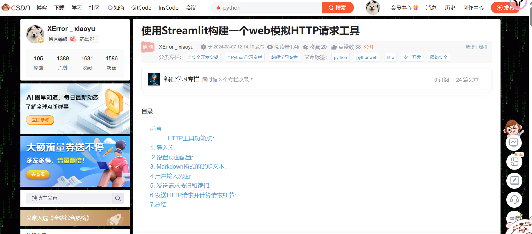 最初就是因为在微信看到一篇文章中,看到此http工具的制作因为觉得Streamlit有无限开的可能,对于快速构建安全工具有着极大的便利,下面对此工具进行学习一番