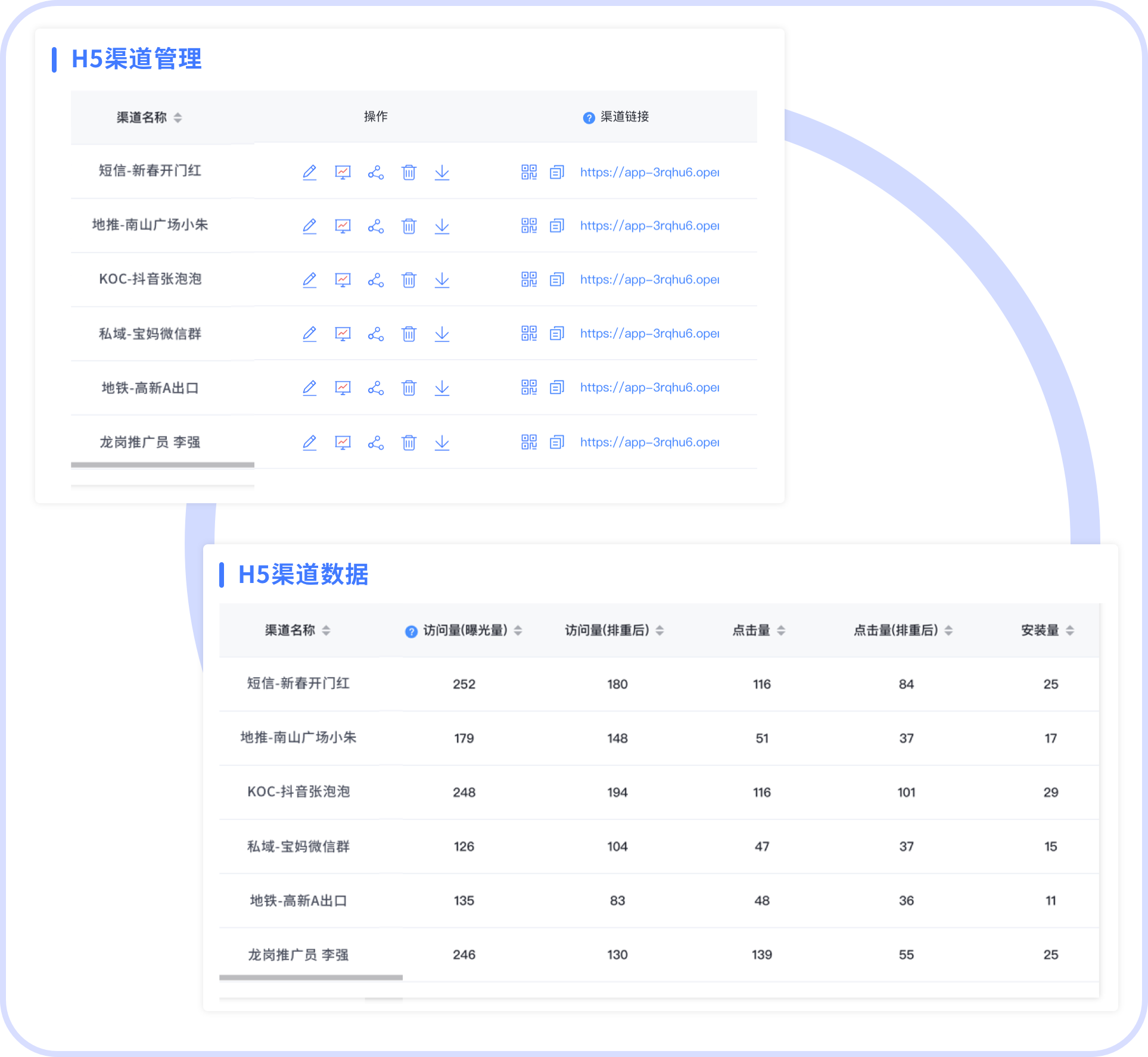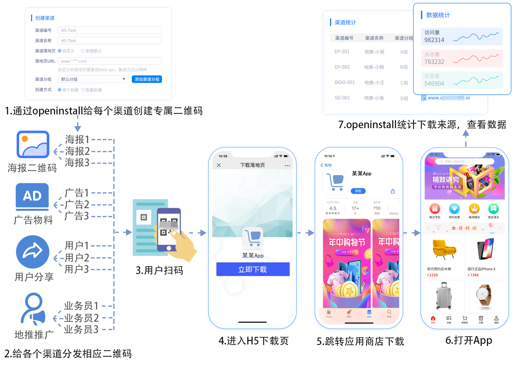 通过给不同渠道生成不同参数ID的二维码或链接(链接和二维码其实是一回事),然后投放到该渠道,当用户通过点击或扫码之类的方式访问该H5落地页时,SDK会将所需的渠道信息采集后上传到第三方的服务器,然后和App的数据进行匹配归因,实现安装来源的精准追踪。