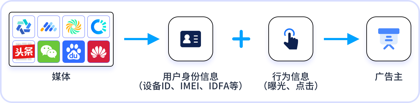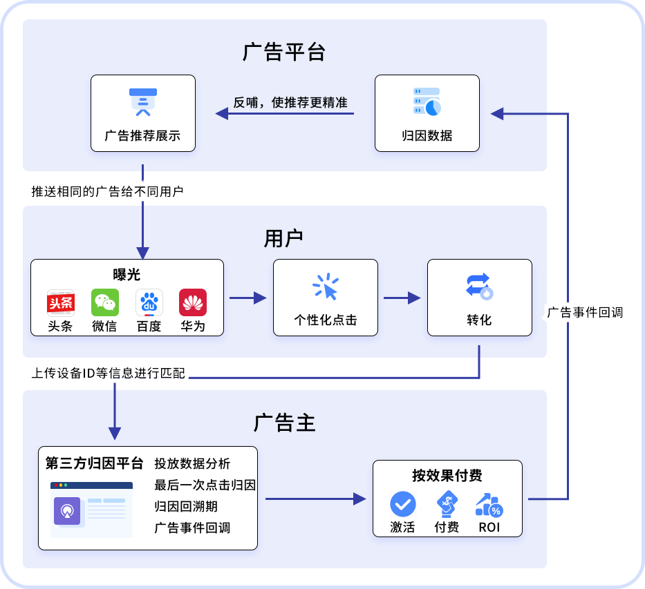 通常流程是:用户在访问广告后,广告平台方会上传设备ID、IDFA等身份信息,以及曝光、点击等信息到服务端,等到用户安装成功App后,广告主再把App内获取到用户身份信息和广告平台回传的数据进行匹配,就能得到完整的归因链条了。