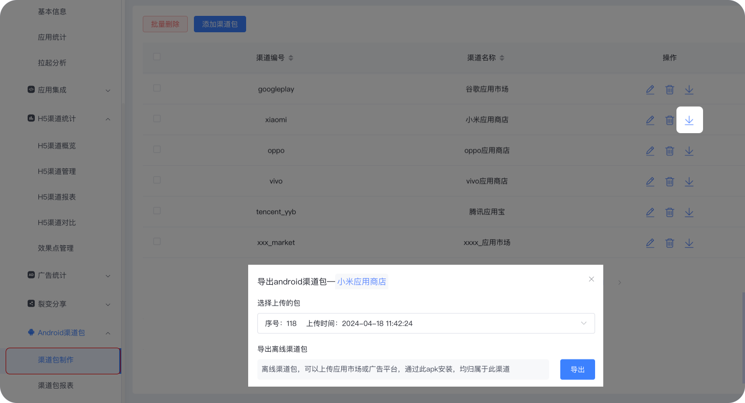 当然市面上也有不少打包工具,比较简单的可以用openinstall上传一个标准安装包,然后根据需求一键导出多个渠道包进行分包统计。
