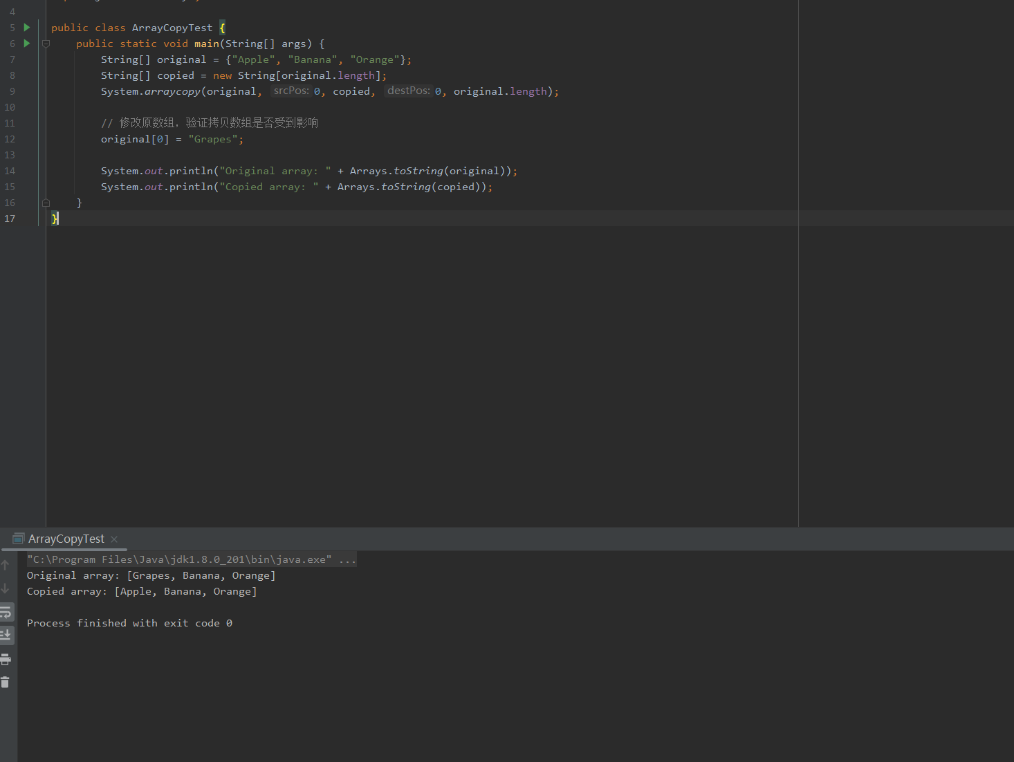 这表明 System.arraycopy() 成功复制了数组,且修改原数组后,拷贝的数组不受影响。