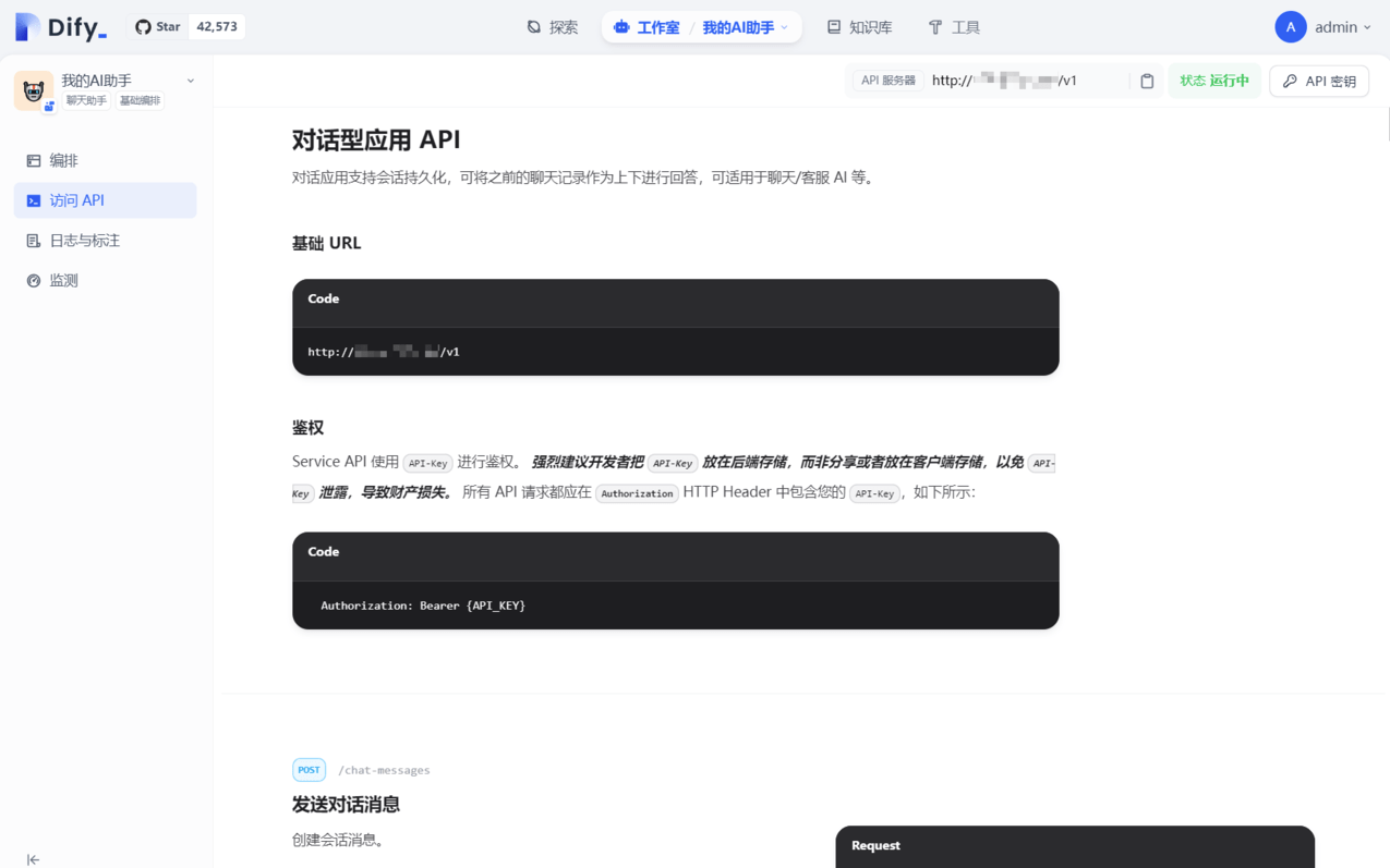 4. 查看API调用:您可以在编排里进行调试与预览,例如编写提示词、导入知识库等。一旦完成,可以点击左侧的访问API,查看API的调用方法。