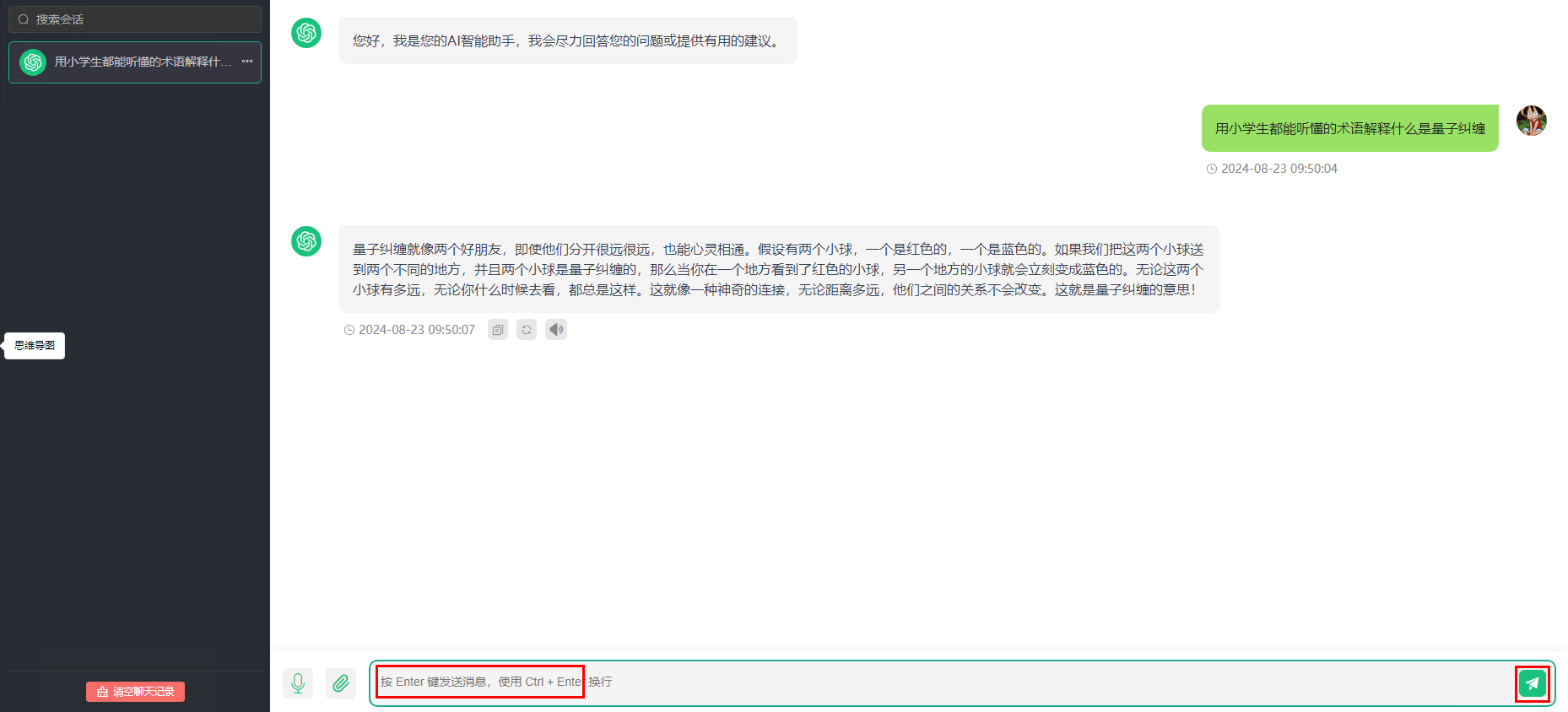 2.使用AI对话功能:按下图所示,选择助手的角色,后端API类型并单击确定(此类型为Geek-AI后台管理界面添加的API-KEY的类型),在下面的对话框中,输入对话内容,单击发送按钮,即可获取对话结果。