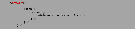 firmware:firmware中“:”之前的内容为引用申明。只有申明后才可以在其他地方引用。Firmware下的fstab 节点没有引用声明,在其他位置就不可以引用。如果要修改fstab节点里的属性,引用firmware节点然后修改其中属性,案例如下: