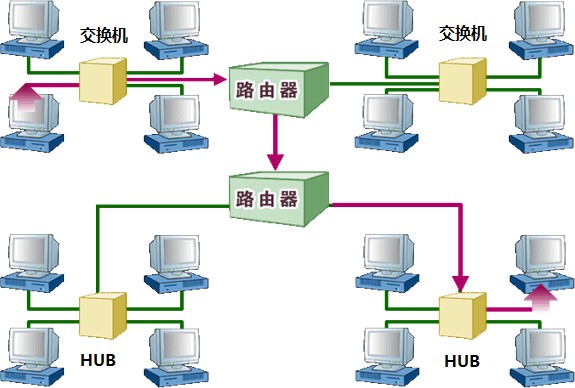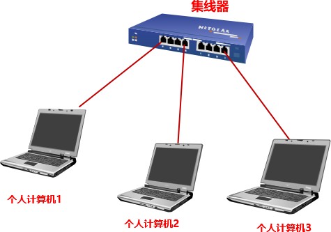 共享带宽的设备,采用广播的形式来传输信息,可以实现多台电脑同时使用一个进线接口来上网或组成局