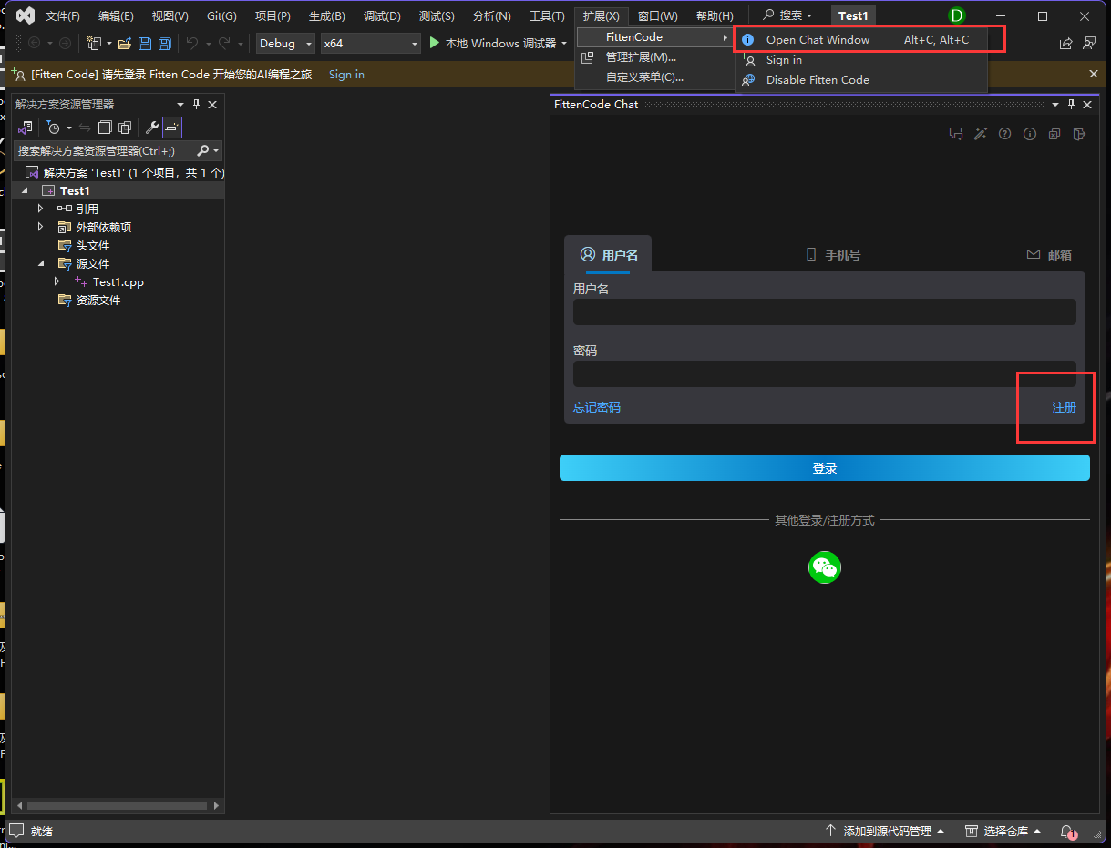 在扩展选项中选中fitten,选择Open Chat Window进入登录界面,完成注册登录