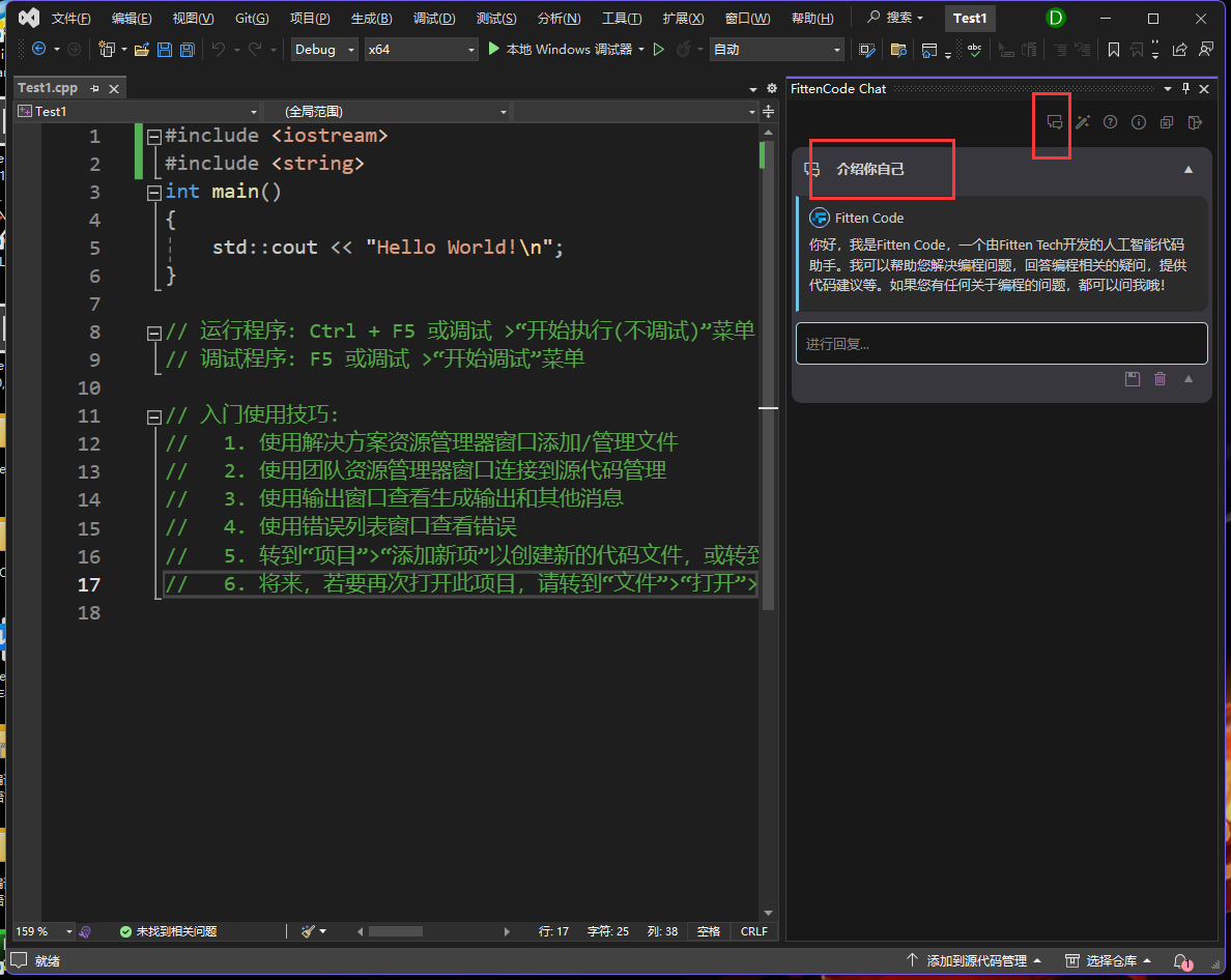 在开始新对话窗口向Fitten Code提问代码bug查找后,Fitten Code可以智能完成debug工作