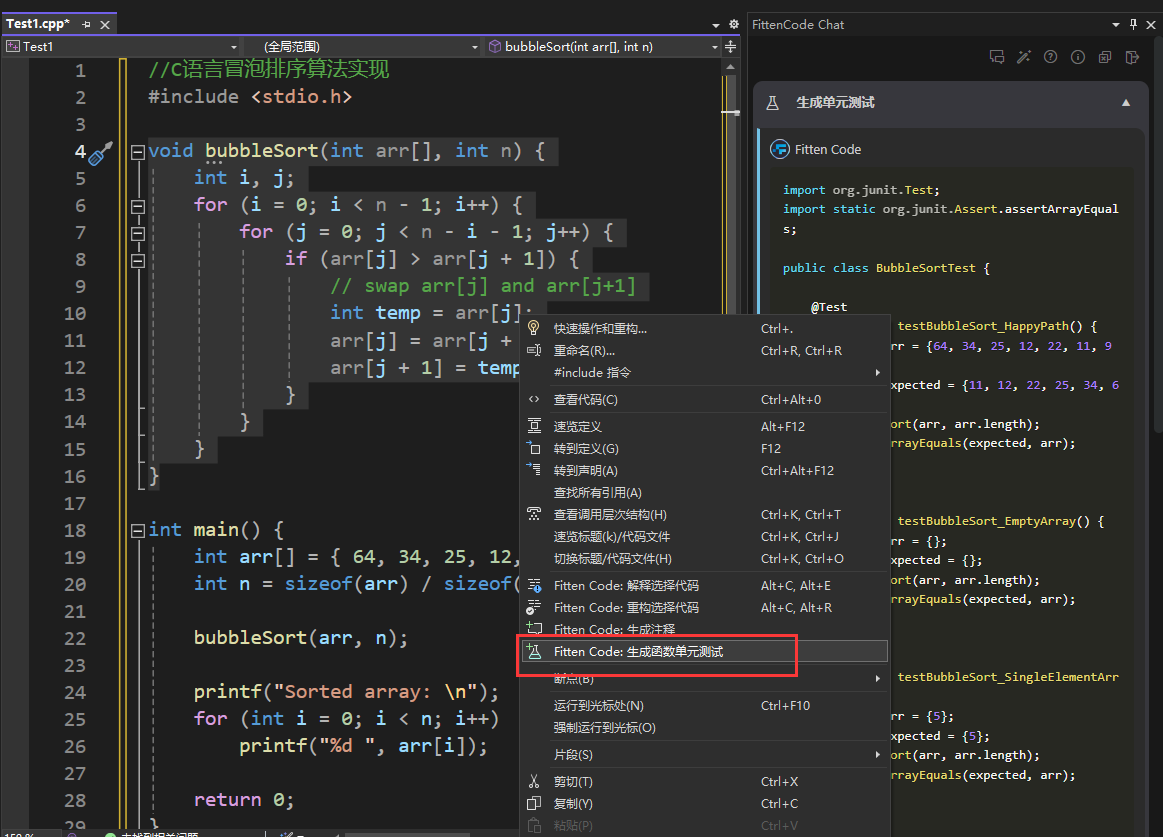 Fitten Code 拥有自动生成单元测试的功能,可以根据代码自动产生相应的测试用例,提高代码质量和可靠性。通过选中代码段后右键选择 "Fitten Code – 生成函数单元测试" 来实现,如下图所示: