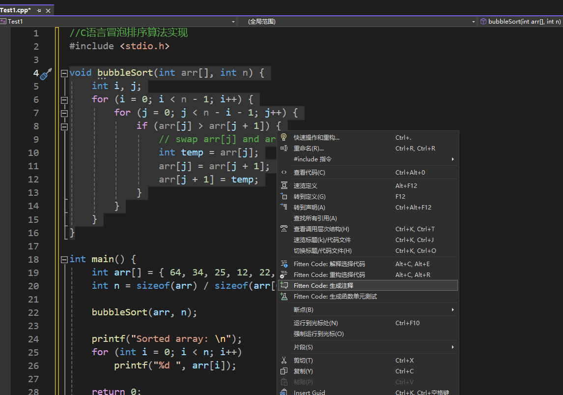 打开代码文件,输入一段代码,Fitten Code 就会为您自动补全代码: