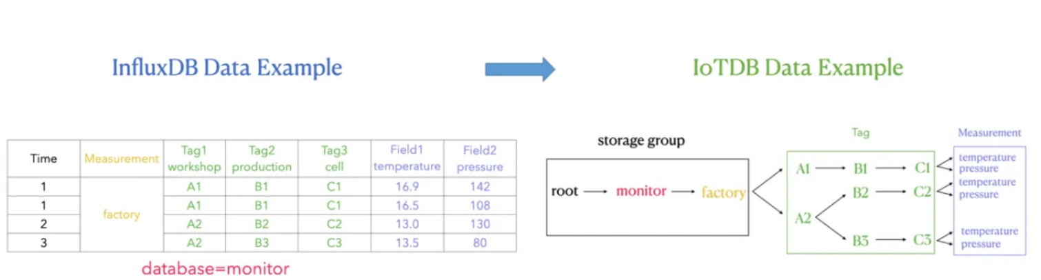我们在 IoTDB 中使用 database 和 measurement 之间的路径来表达 InfluxDB tag 的概念,也就是图中右侧绿色方框的部分。