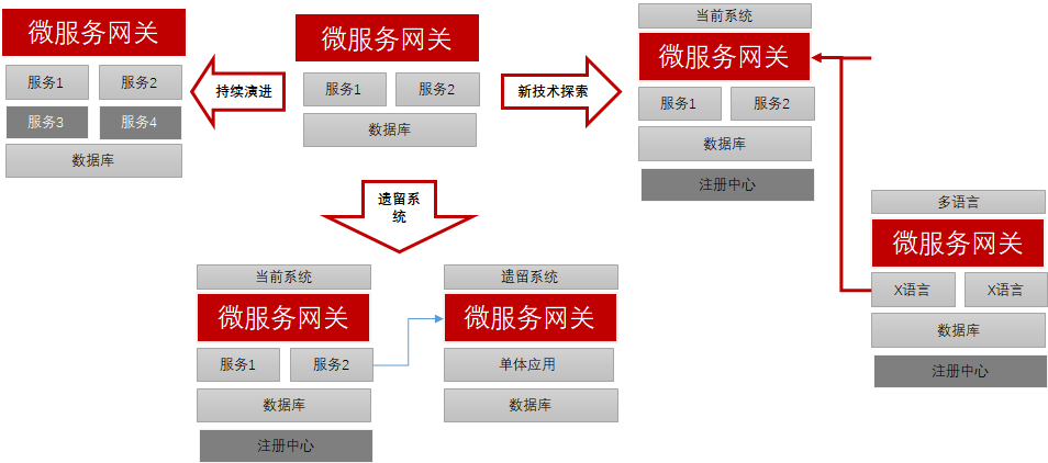 持续演进包括增加微服务、遗留系统、技术创新等几个场景。
