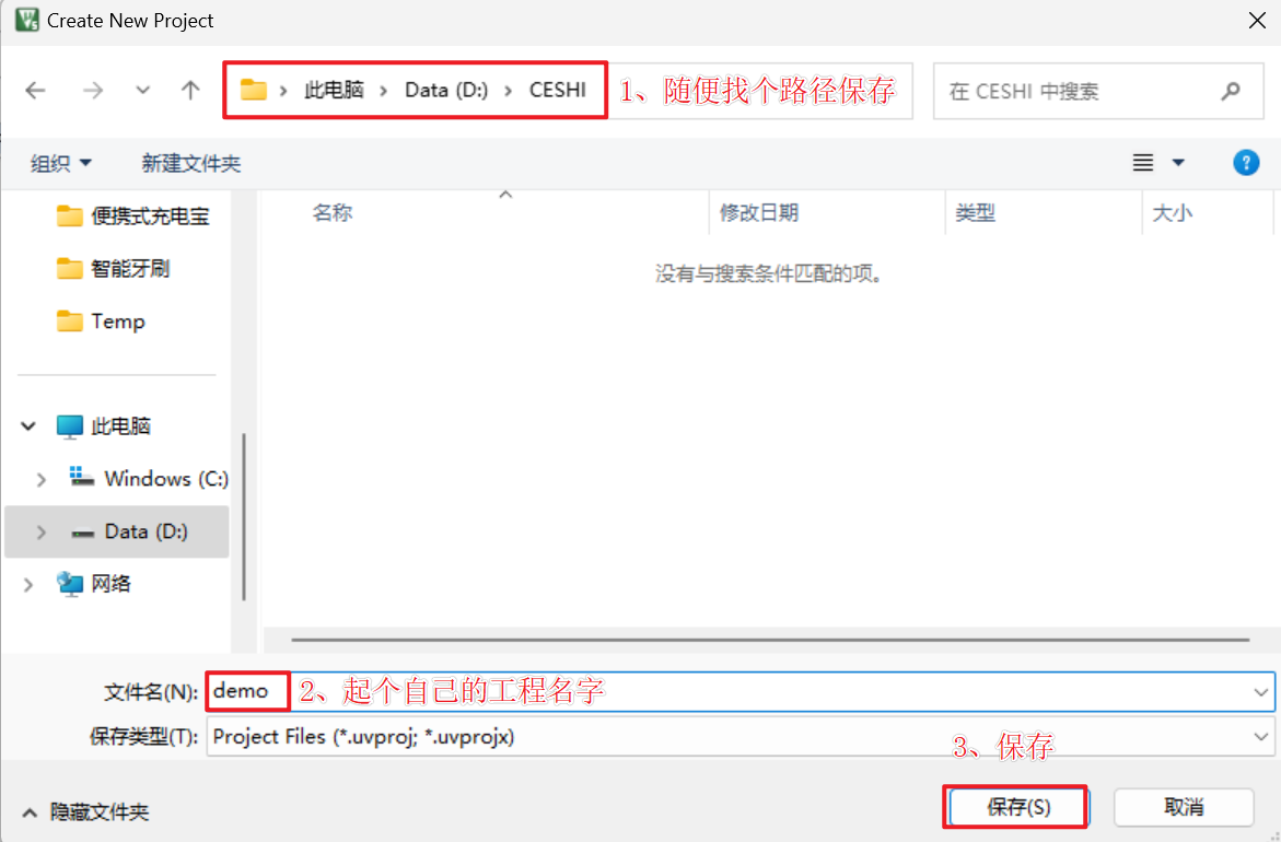 3、找个目录->起个自己工程的名字我这里焦demo,然后保存