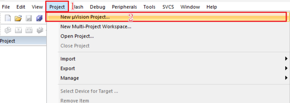 2、点击Project(项目)->New uVison Project(新建项目)