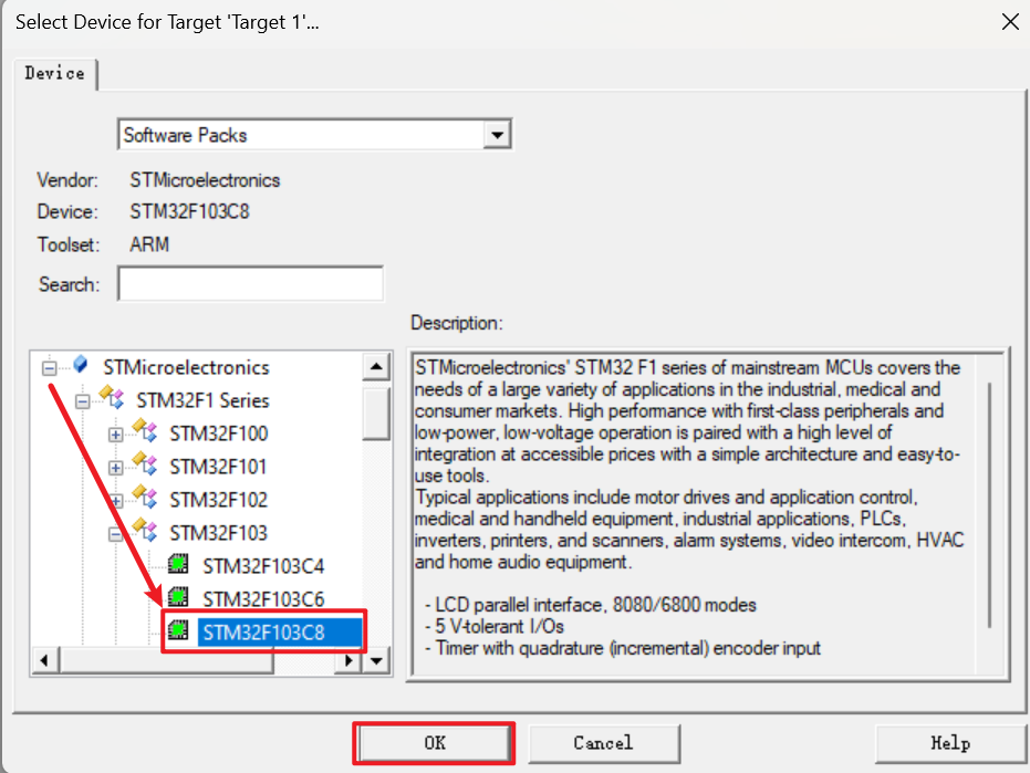 4、 选择自己的芯片,我这里选择的是STM32F103C8,很常用的一款芯片