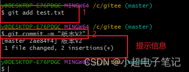9、可以看到提示信息 2 files changed 表示两个文件。