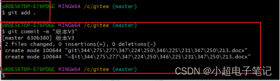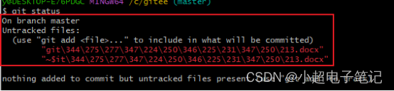 8、这里可以看到提示还有个.docx的文件没有添加,因为我的文件夹中有个word文档。这里正好我们使用另外一个命令git add .(全部添加命令),添加它。