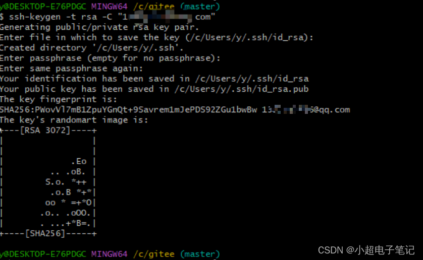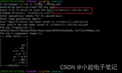 1、下面我们开始,远程库的连接使用,使用ssh--keygen -t rsa -C “你的邮箱地址”,生成密钥(用于连接gitee使用,让你的gitee账户认识你),输入玩指令之后一路回车就可以了,中间的是密码什么的咱们也不需要。
