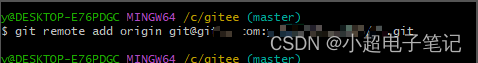 6、下面我们接着进行本地与远程库关联。打开Git Bash Here(注意在自己的项目文件夹里右键打开),使用 git remote add origin “你的SSH” ,这里的origin是github的默认名字,我们可以自己定义个名字使用,名字后面跟着的是我们上面复制的SSH。