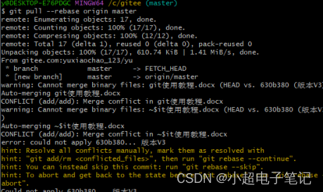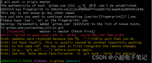 9、如果和我一样提示这样的错误,是因为远程库包含了本地没有的文件,这里两种方法第一种:使用git push -f origin master 这里就强行本地覆盖远程了,远程里多的东西也就被删除了。第二种:这种比较安全,使用git pull --rebase origin master,这个命令是将远程库的文件拉取到本地合并,这也是我们平时需要保存远程库到本地的方法,我们使用一下。