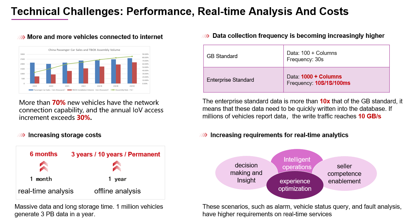 数据分析难:随着用户对服务的期望日益增长,他们对车辆告警、详单查询、故障快速分析等实时性服务的需求也在不断提升。这种趋势迫使厂商不断进行系统技术升级,以确保能够及时响应并满足用户的需求。这种升级的压力也传递到了数据库层面,要求数据库进行技术创新,在面对海量数据和高并发请求时仍能保持快速响应。